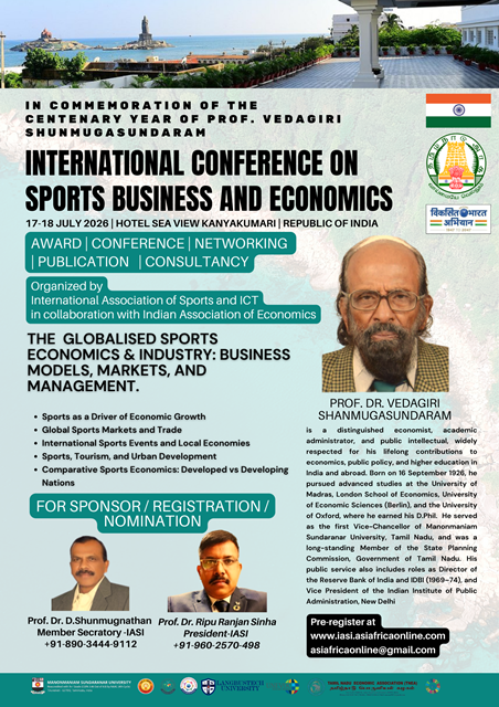 As the President of the International Association of Sports and ICT (IASI), it is my distinct honor to welcome you to the International Conference on Sports Business and Economics (ICSBE 2026). This summit, held at the historic confluence of three seas in Kanyakumari, serves as a pivotal platform for scholars and industry leaders to explore the multi-dimensional impact of the global sports industry.